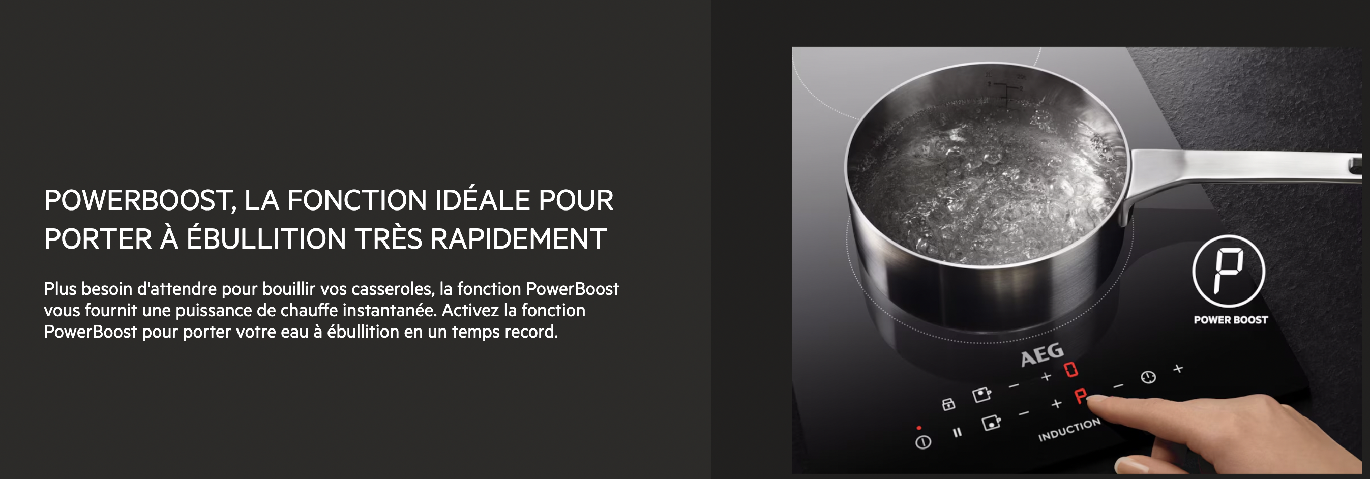 Plus besoin d'attendre que les casseroles bouillent. La fonction PowerBoost vous donne une poussée de chaleur instantanée, faisant bouillir l'eau en moins de 90 secondes. Idéale si vous souhaitez faire bouillir rapidement une grande casserole d'eau.